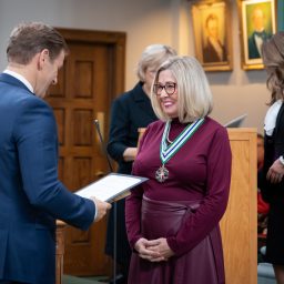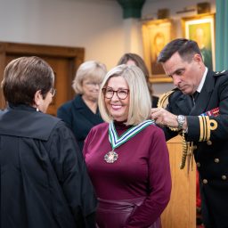 Her Honour, The Honourable Joan Marie Aylward, O.N.L. receiving the Order of Newfoundland and Labrador Insignia, presented by The Honourable Deborah E. Fry with help from Aide-de-Camp LCdr Tony Young.