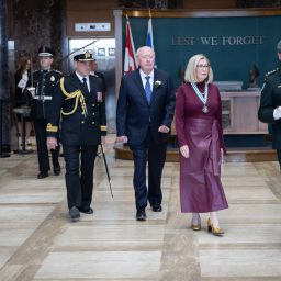 Her Honour, The Honourable Joan Marie J. Aylward, Lieutenant Governor of Newfoundland & Labrador, & His Honour, The Honourable Carl R. Thompson, entering the Newfoundland and Labrador House of Assembly to begin the installation ceremony.