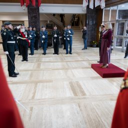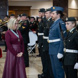Her Honour, The Honourable Joan Marie Aylward, O.N.L inspecting the Guard of Honour, comprised of members of the Royal Canadian Mounted Police in Newfoundland and Labrador, Canadian Armed Forces, & Royal Newfoundland Constabulary, accompanied by Guard Commander Capitan Michael Walsh.