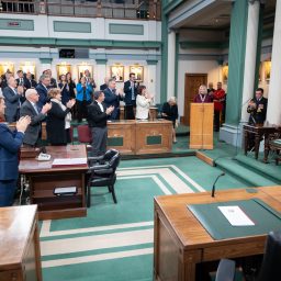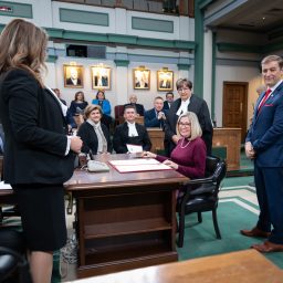 Her Honour signing the Lieutenant Governor’s Proclamation, with members of the Official Party.