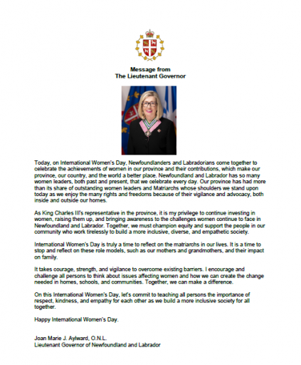 A Message from The Honourable Joan Marie Aylward, O.N.L., Lieutenant Governor of Newfoundland and Labrador, on International Women’s Day 2024